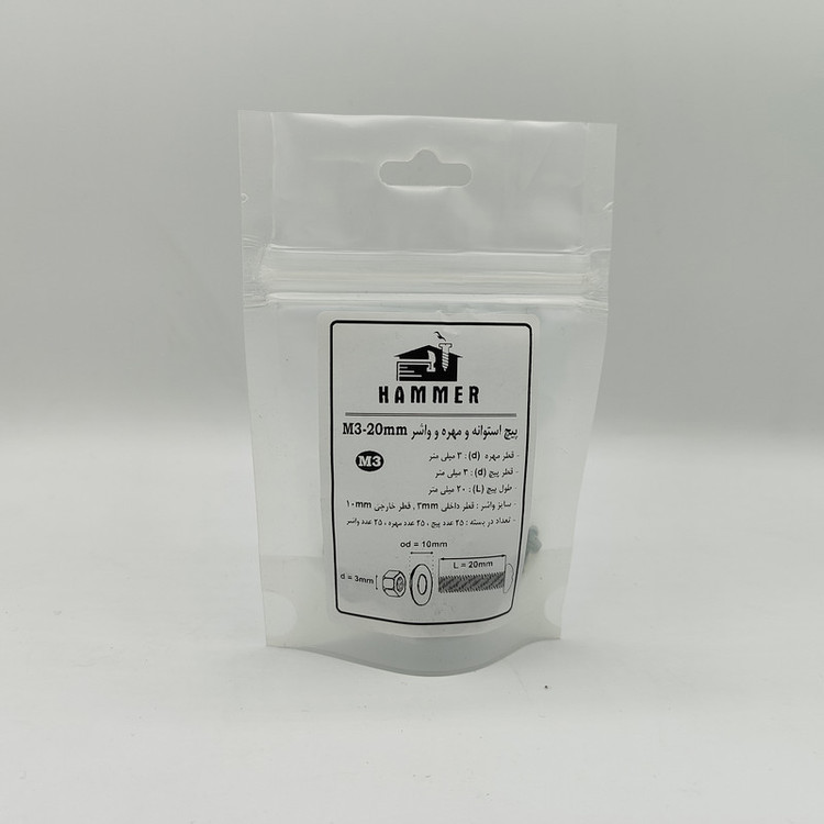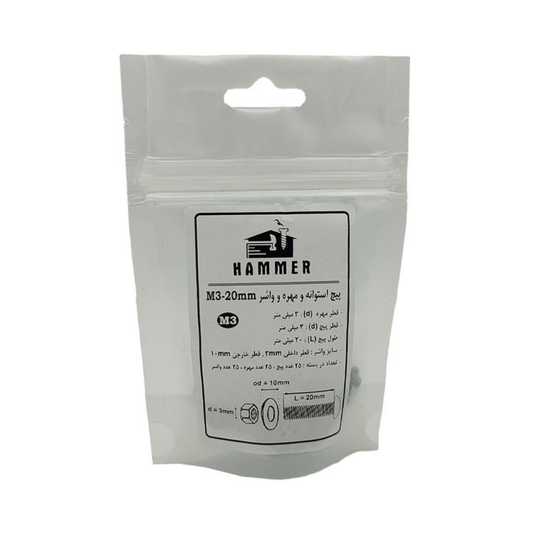 پیچ و مهره و واشر هامر مدل استوانه کد M3-20mm بسته 75 عددی