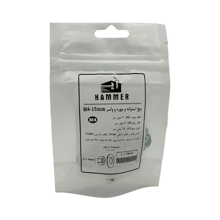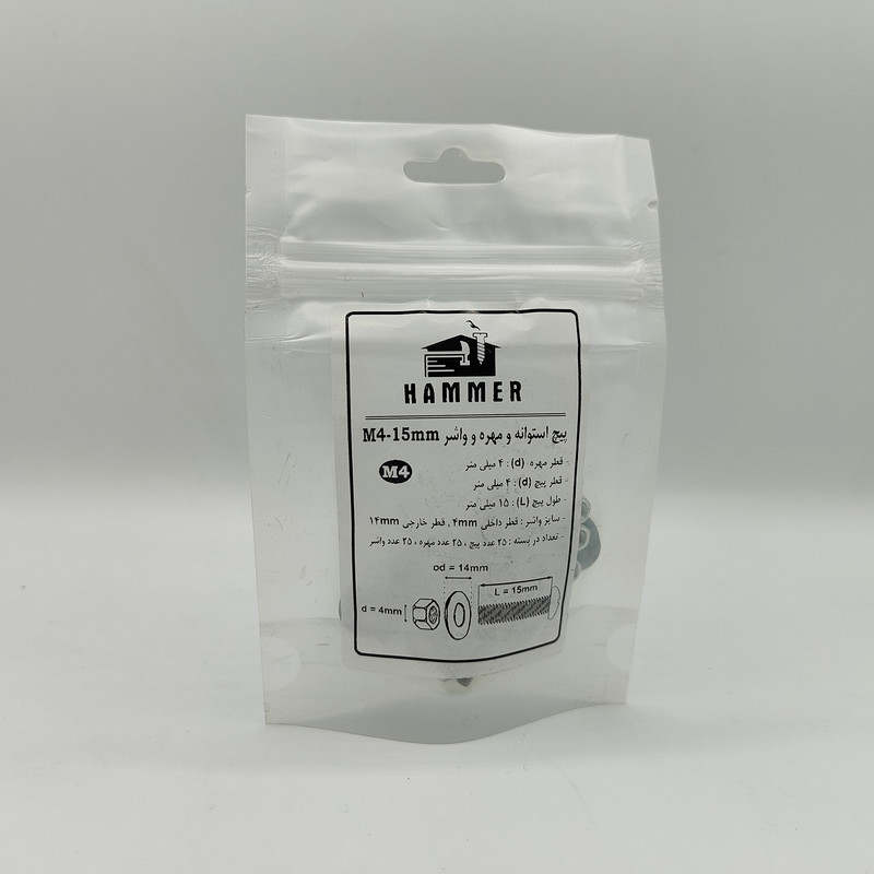 سایر توضیحات: بسته بندی زیپ دار با برند هامر مطابق تصویر ، دارای قطر استاندارد 4 میلی متر و طول پیچ استوانه 4 میلی متر ، بسته بندی 75 عددی (( توجه : لطفا جهت خرید به مشخصات فنی ترسیم شده و ذکر شده در تصاویر توجه کنید))