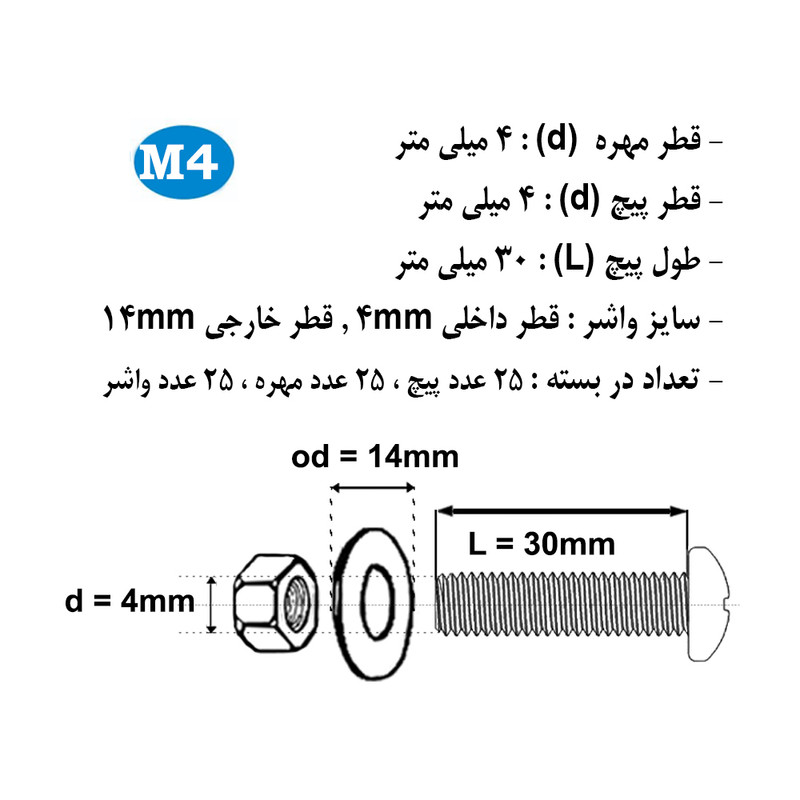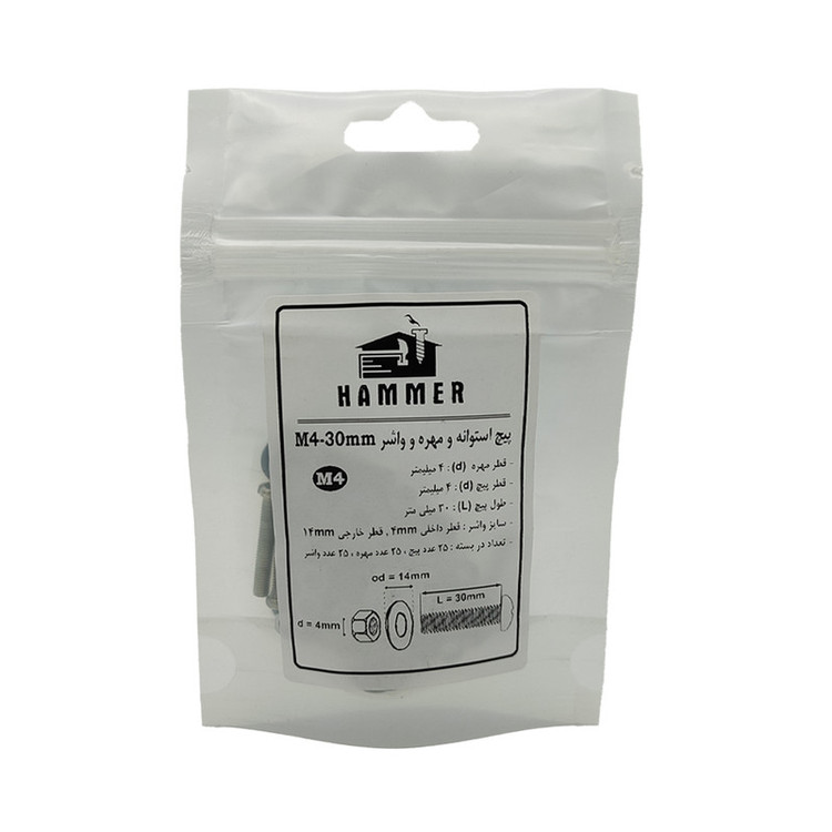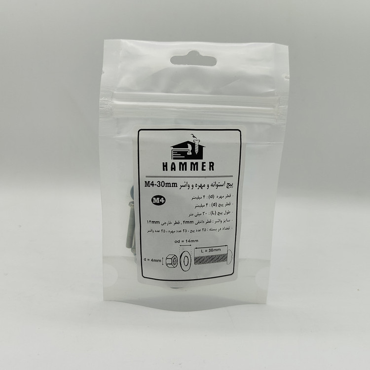 سایر توضیحات: بسته بندی زیپ دار با برند هامر مطابق تصویر ، دارای قطر استاندارد 4 میلی متر و طول پیچ استوانه 4 میلی متر ، بسته بندی 75 عددی (( توجه : لطفا جهت خرید به مشخصات فنی ترسیم شده و ذکر شده در تصاویر توجه کنید))