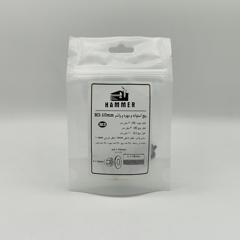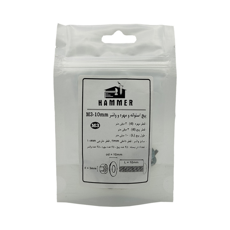 سایر توضیحات: بسته بندی زیپ دار با برند هامر مطابق تصویر ، دارای قطر استاندارد 3 میلی متر و طول پیچ استوانه 3 میلی متر ، بسته بندی 75 عددی (( توجه : لطفا جهت خرید به مشخصات فنی ترسیم شده و ذکر شده در تصاویر توجه کنید))
