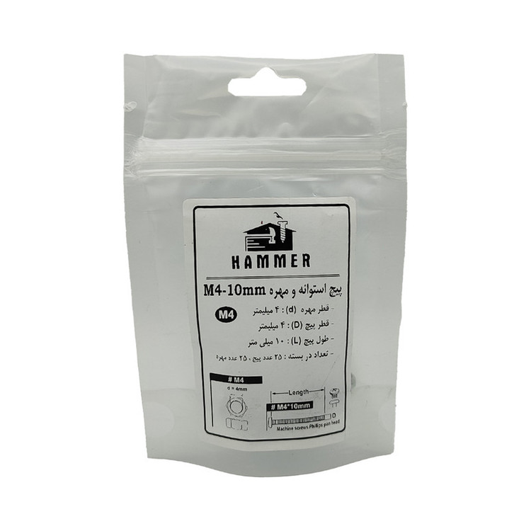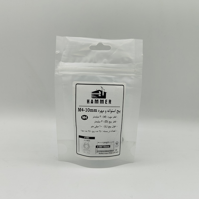 سایر توضیحات: بسته بندی زیپ دار با برند هامر مطابق تصویر ، دارای قطر استاندارد 4 میلی متر و طول پیچ استوانه 4 میلی متر ، بسته بندی 50 عددی (( توجه : لطفا جهت خرید به مشخصات فنی ترسیم شده و ذکر شده در تصاویر توجه کنید))
