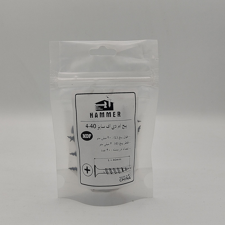 سایر توضیحات: بسته بندی زیپ دار با برند هامر مطابق تصویر ، دارای قطر استاندارد 4 میلی متر و طول 40 میلی متر ، بسته بندی های 40 عددی ، بدون پس دادن رنگ سیاه و سیاه کردن دست ها و قطعات ، ساخت چین