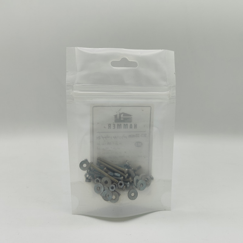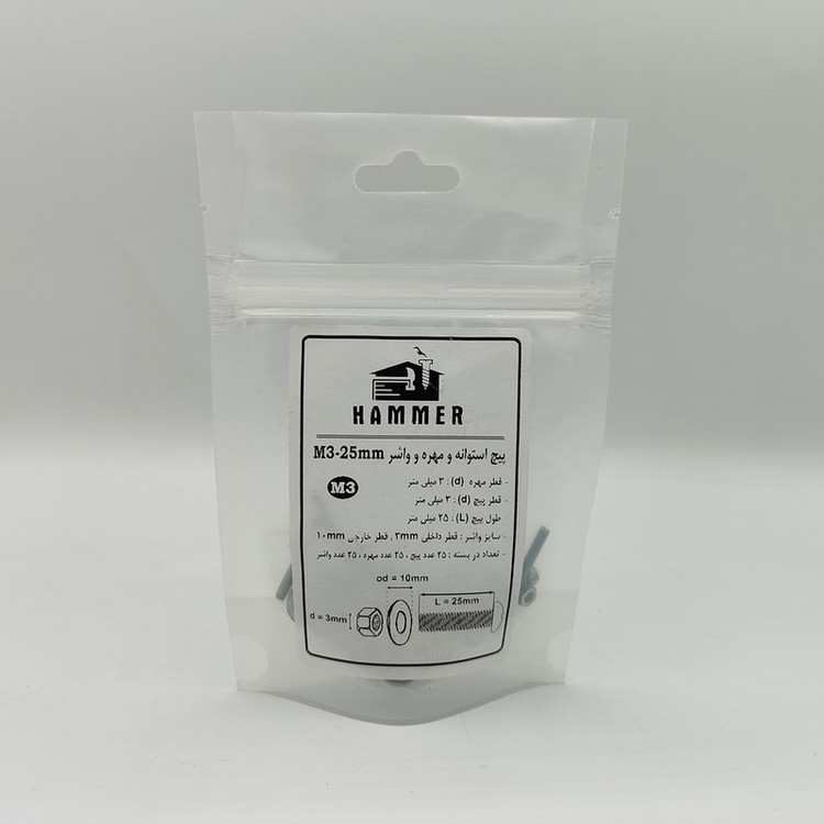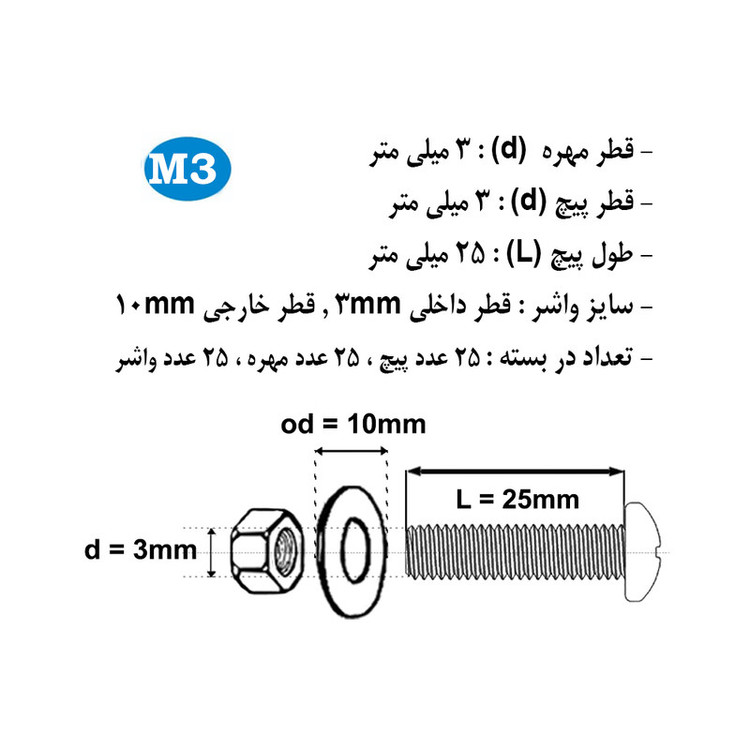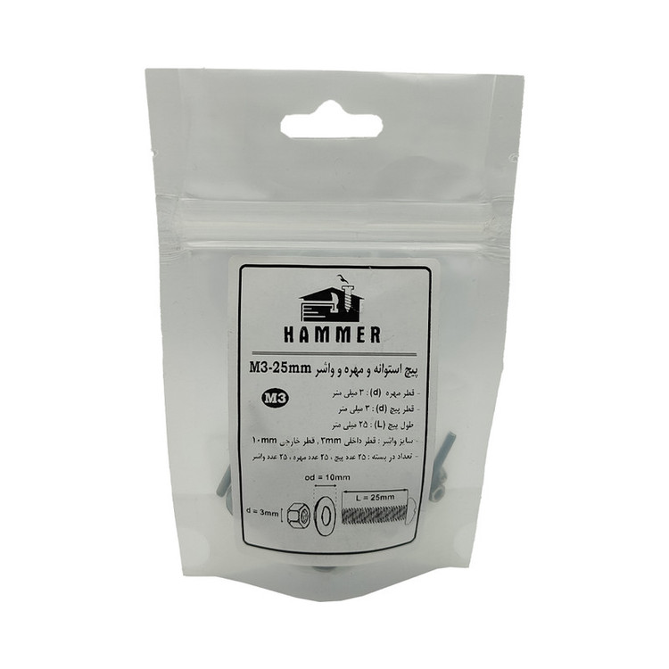 سایر توضیحات: بسته بندی زیپ دار با برند هامر مطابق تصویر ، دارای قطر استاندارد 3 میلی متر و طول پیچ استوانه 3 میلی متر ، بسته بندی 75 عددی (( توجه : لطفا جهت خرید به مشخصات فنی ترسیم شده و ذکر شده در تصاویر توجه کنید))