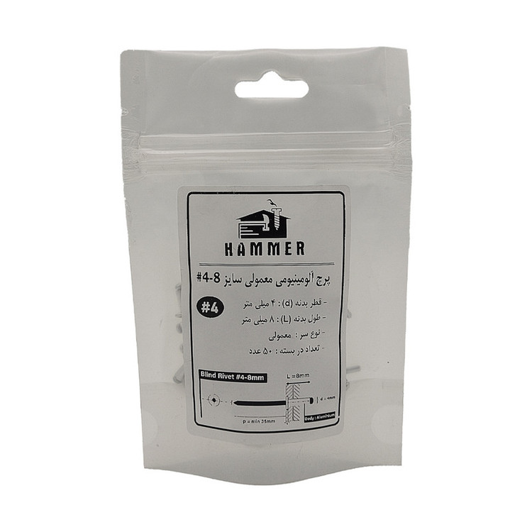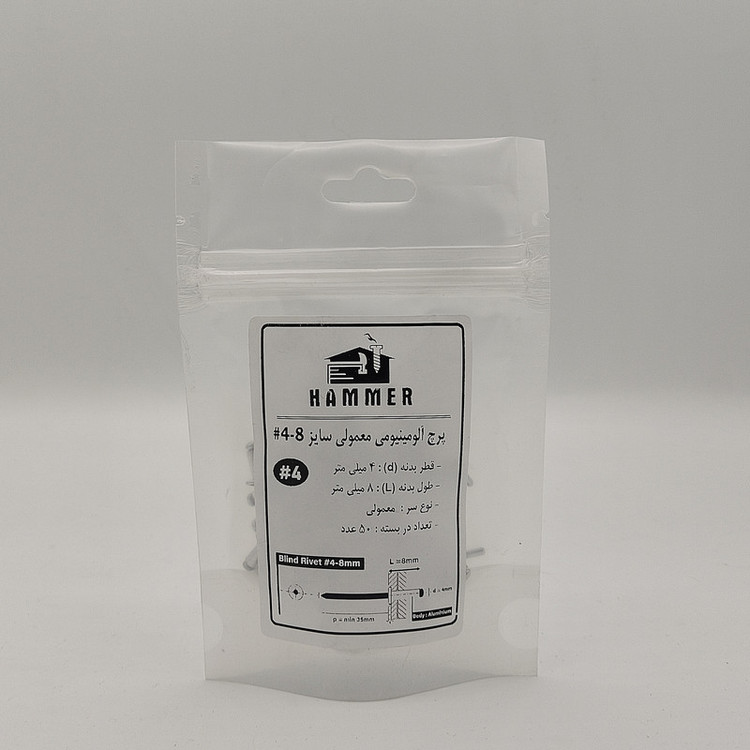بسته بندی زیپ دار با برند هامر مطابق تصویر ، دارای قطر استاندارد 4 میلی متر و طول بدنه آلومینیومی 8 میلی متر ، بسته بندی های 50 عددی ، سر پرچ از نوع عدسی ، درجه کیفی A+++ (( توجه : لطفا جهت خرید به مشخصات فنی ترسیم شده و ذکر شده در تصاویر توجه کنید))