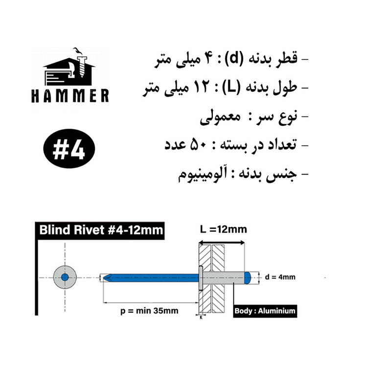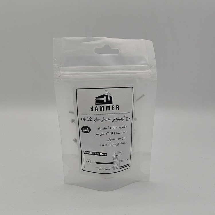 بسته بندی زیپ دار با برند هامر مطابق تصویر ، دارای قطر استاندارد 4 میلی متر و طول بدنه آلومینیومی 12 میلی متر ، بسته بندی 50 عددی ، سر پرچ از نوع عدسی ، درجه کیفی A+++ (( توجه : لطفا جهت خرید به مشخصات فنی ترسیم شده و ذکر شده در تصاویر توجه کنید))