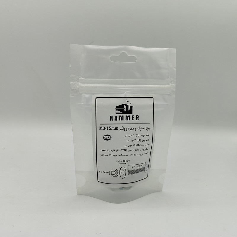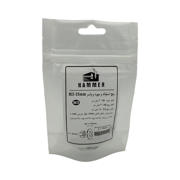 سایر توضیحات: بسته بندی زیپ دار با برند هامر مطابق تصویر ، دارای قطر استاندارد 3 میلی متر و طول پیچ استوانه 3 میلی متر ، بسته بندی 75 عددی (( توجه : لطفا جهت خرید به مشخصات فنی ترسیم شده و ذکر شده در تصاویر توجه کنید))