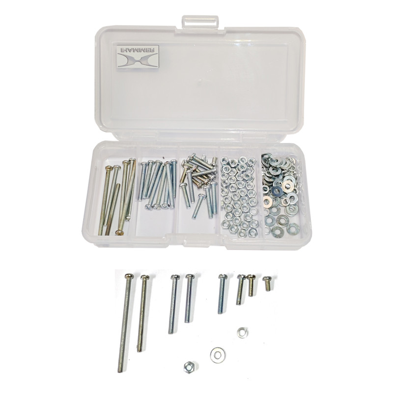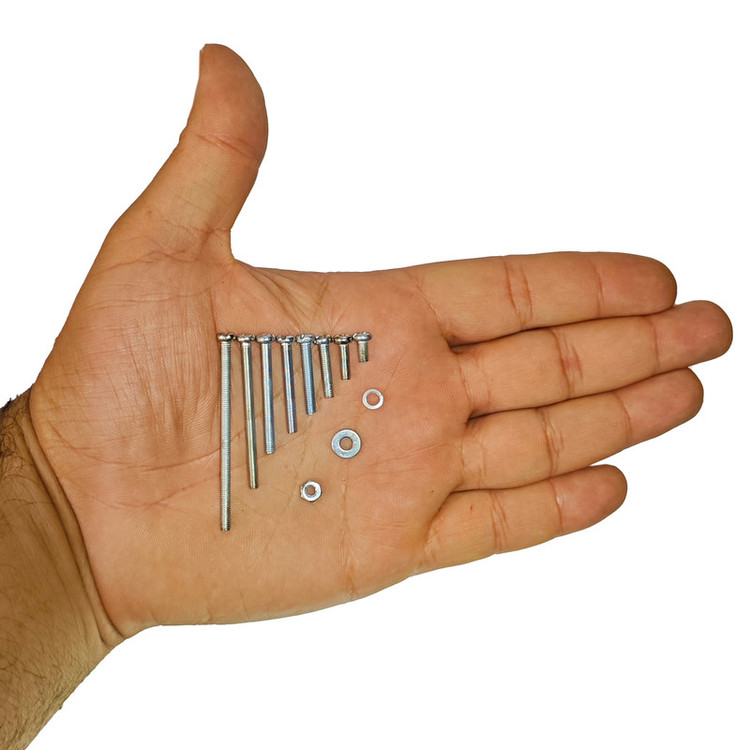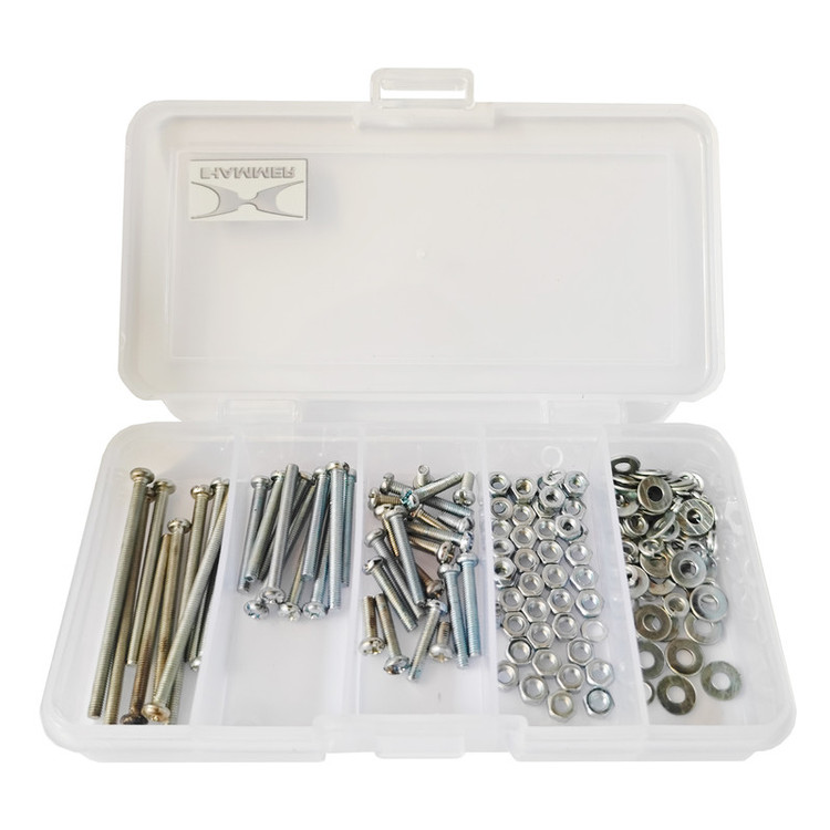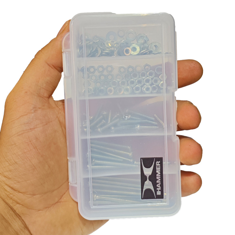 تعداد 120 عدد مهره آهنی M۳ نقره ای و 120 عدد واشر تخت M۳-۹ نقره ای و 120 عدد واشر فنری M۳ نقره ای و 120 عدد پیچ استوانه M۳ نقره ای در 8 سایز طول از 6 میلیمتر تا 50 میلی متر و جعبه ارگانایزر کوچک و کم جا