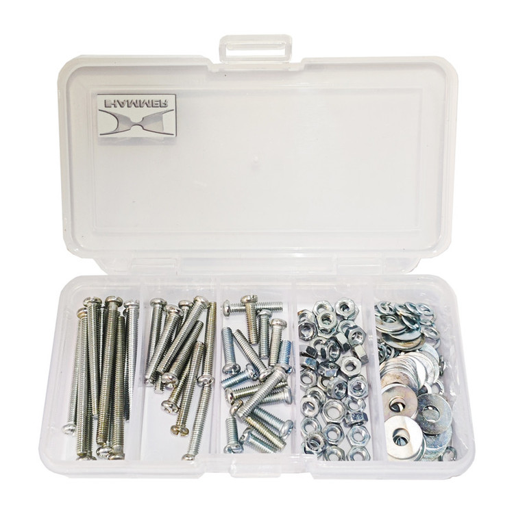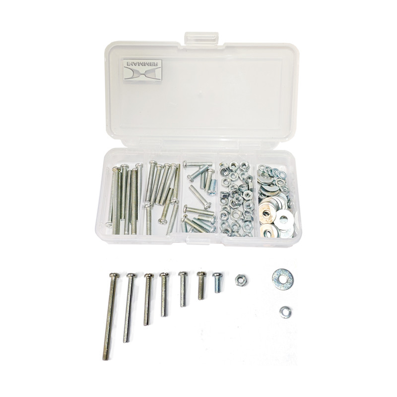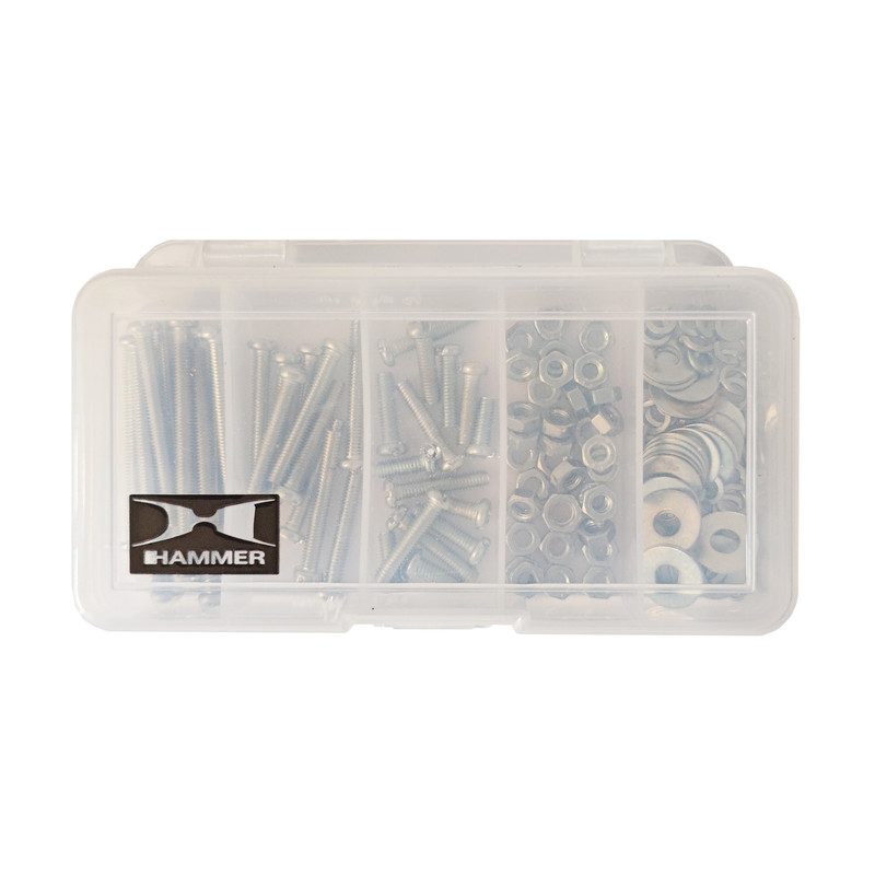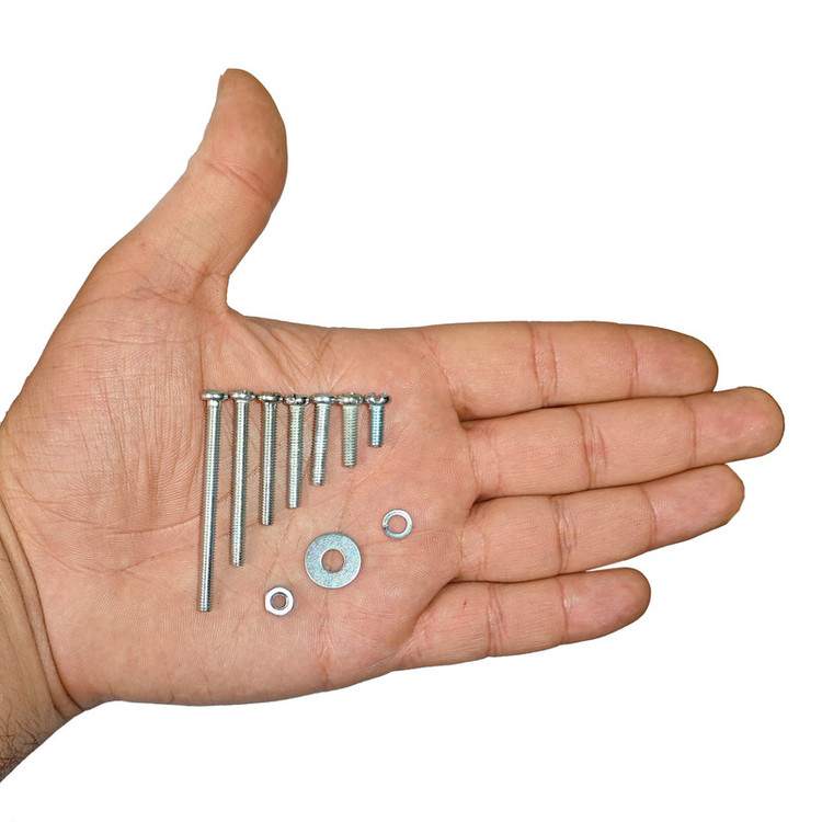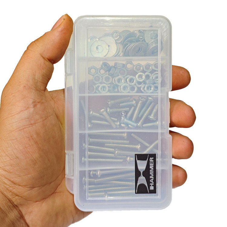 تعداد 70 عدد مهره آهنی M۴ نقره ای و 70 عدد واشر تخت M۴-14 نقره ای و 70 عدد واشر فنری M۴ نقره ای و 70 عدد پیچ استوانه M۴ نقره ای در ۷ سایز طول از ۱۰ میلی متر تا ۵۰ میلی متر و جعبه ارگانایزر کوچک و کم جا