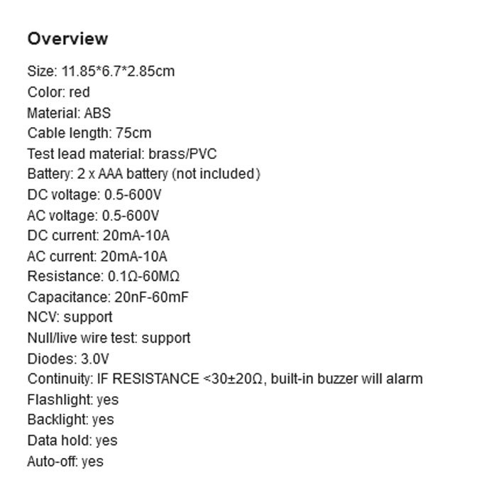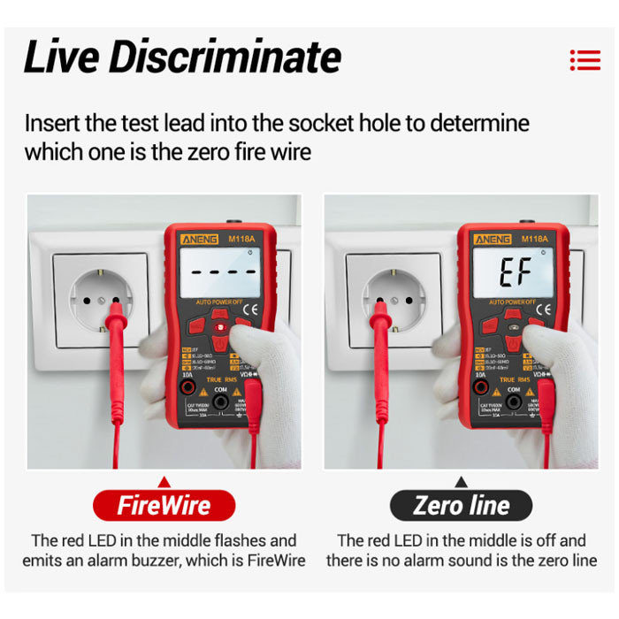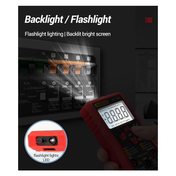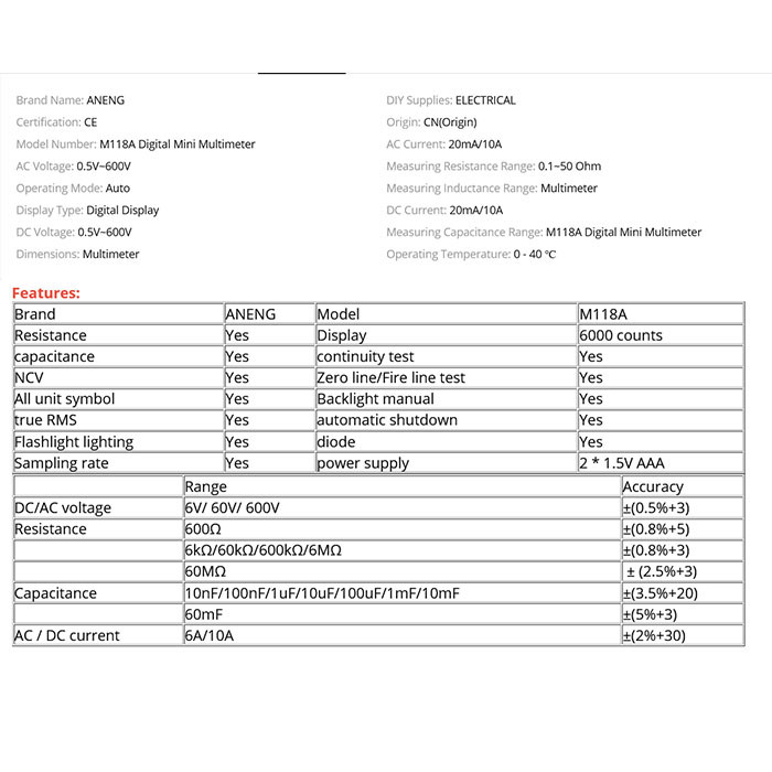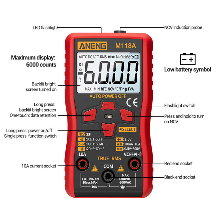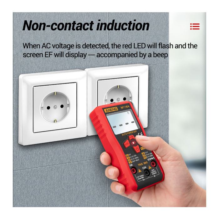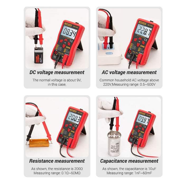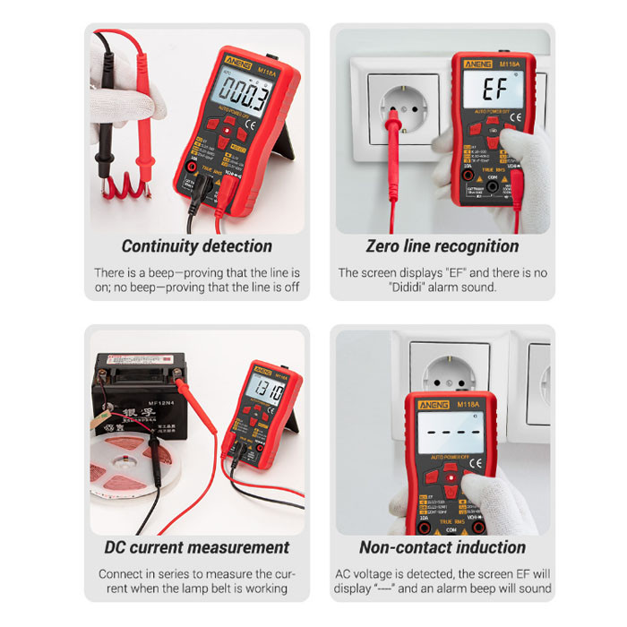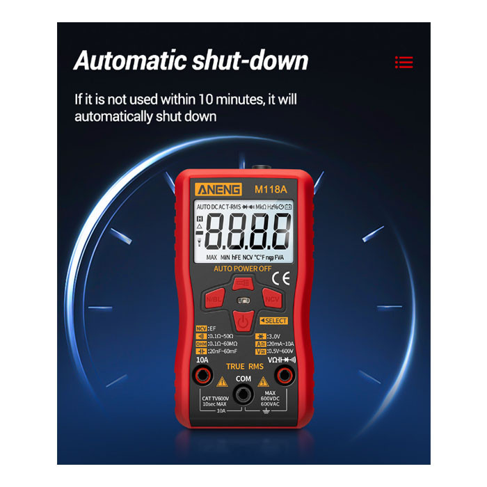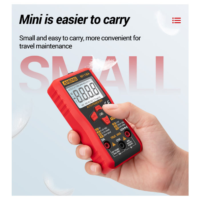 مینی مولتی متر ANENG مدل M118A توانایی سنجش خودکار ولتاژ AC و DC و مقاومت و خارن و .. را دارا میباشد